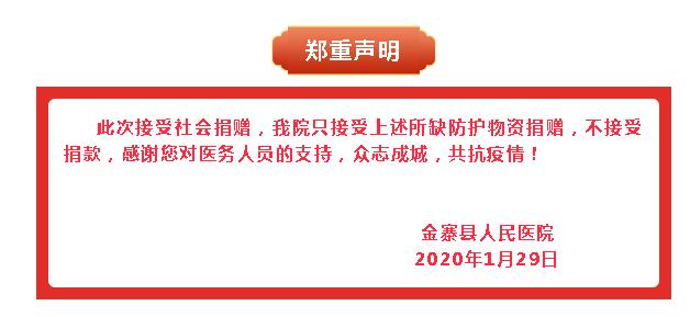 自新型冠状病毒感染的肺炎疫情发生以来,金寨县人民医院作为县委、县政府确定的唯一定点收治医院,工作任务繁重,责任重大,目前医疗防护物资紧缺。为更好地救治患者及做好医护人员的保护,确保防治工作有条不紊、安全高效进行,我院现开通接受捐赠通道,接受社会各界和企业依法依规捐赠以下医用防护物资: