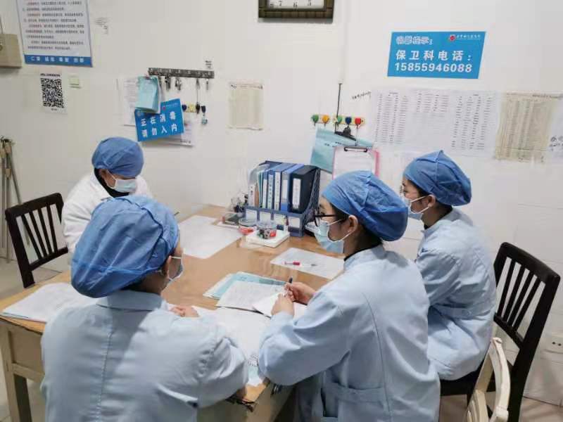 隔离病区,刘苑(图片左一)正在带领护士业务学习