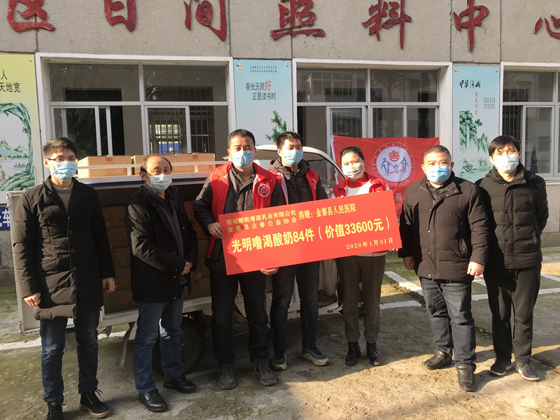四方各界献爱心,在这场抗击疫情的战役中,像储先生、李女士这样的社会爱心人士还有很多,前几日做好事不愿留名,卸下一车蔬菜就离开的“最美蔬菜大哥”;还有1月29日由春雨公益协会牵头组织成立的爱心车队,共计17辆爱心专车不分日夜免费接送医护人员上下班;1月31日由金寨众善公益协会联合湖南雨帆乳液有限公司向我院捐赠的光明酸奶饮品......他们虽不能冲到一线去战斗,却无时无刻不在关注着疫情,用实际行动守护着“前线的战士”,正如那句话所说:“你们在一线守护患者,我们在后方守护你们,愿你们早日平安归来!”