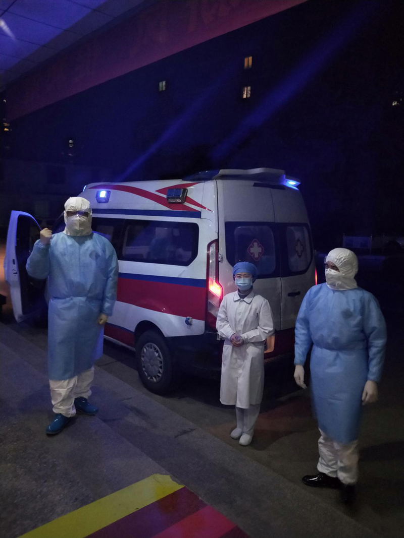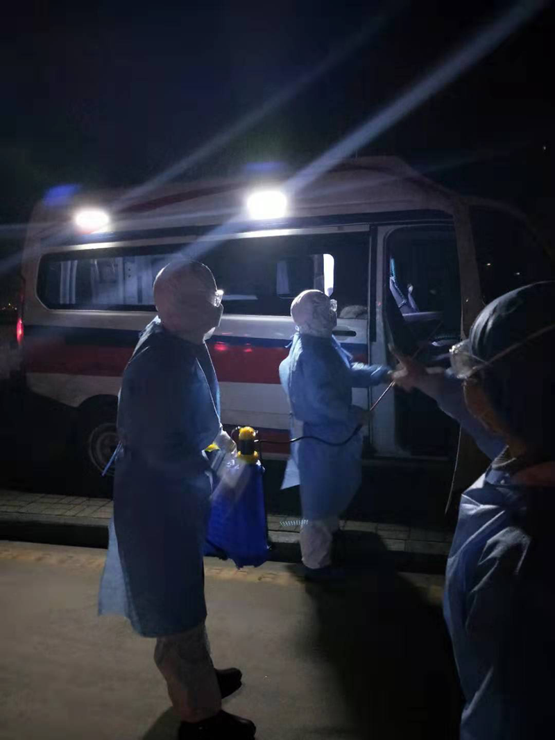 除夕当晚,我院第一例确诊患者急需转往上级医院治疗,为了保证转运过程安全,院感科科长吴晓雪来不及吃上一口年夜饭就在副院长江寒秀的带领下来到了120急救中心,反复叮嘱转诊工作流程,指导120工作人员规范穿好各种防护用品,仔细检查有无疏漏。病人转走后,考虑到污染车辆的终末消毒至关重要,江院长和吴科长一直守候在急救中心,待车辆返程后,亲自穿上防护服协助完成终末消毒,并将高危医疗废物妥善处置后才离开,此时新年的钟声已经敲响。