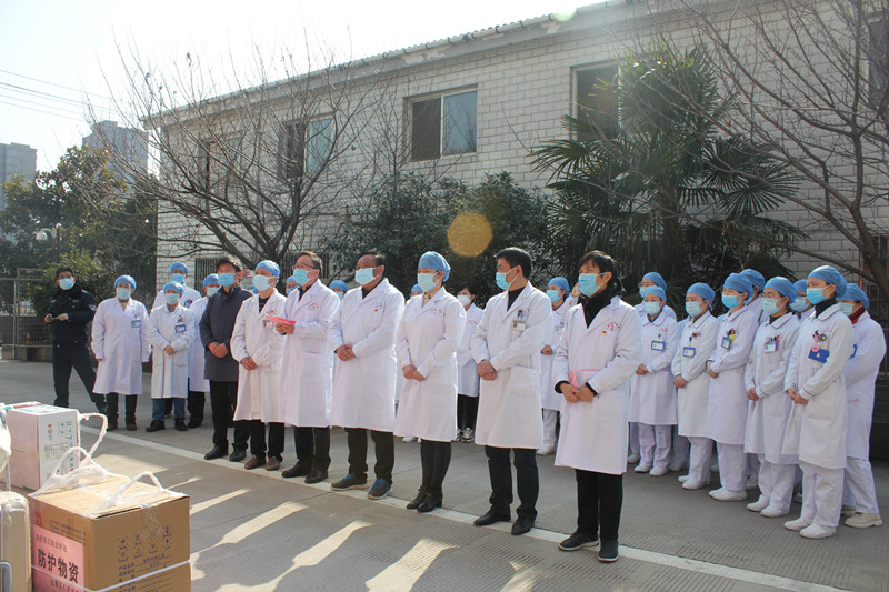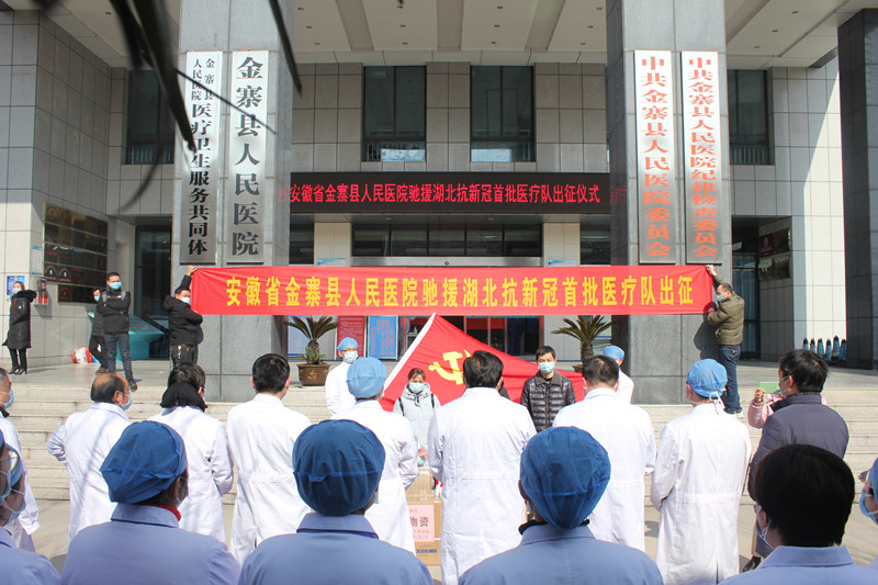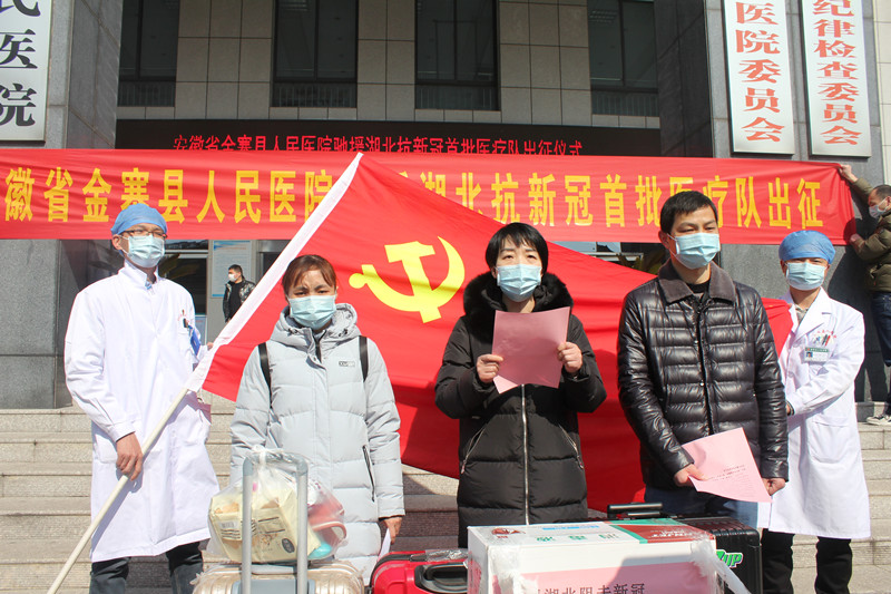 在出征仪式上,院领导班子成员、相关职能科室负责人及医院其他科室职工都主动前来为3名医护人员送行、祝福。院党委书记、院长吴杰宣布医院党委组建医疗队以及对医疗队队长任命,并做讲话,他首先对3位金医战士临危受命,奔赴湖北一线的壮举深表敬意和感谢,指出,他(她)们是金医杰出的代表,是金医的骄傲。同时,吴院长殷殷嘱托,此行异地他乡,山高水长,形势严峻、任务艰巨,大家一定要做好个人防护,保持良好的心态,呵护好自己的健康;要服从省卫健委领队的统一管理,积极参加所在地方的抗疫工作,处处彰显金医人的水平和形象。全县人民和全院的同事们一定会在背后替大家鼓舞加油并祝福每位医护人员都能圆满完成湖北疫情支援任务,平安归来。