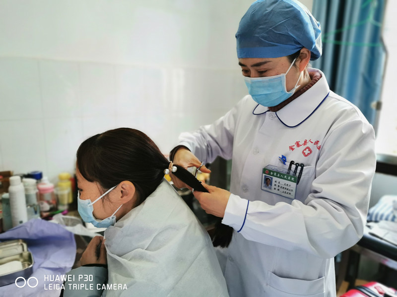 出发前,医疗队成员之一的文道琴剪去长发,同时,今天也是她的生日,祝你生日快乐!全院职工等着你们平安归来!