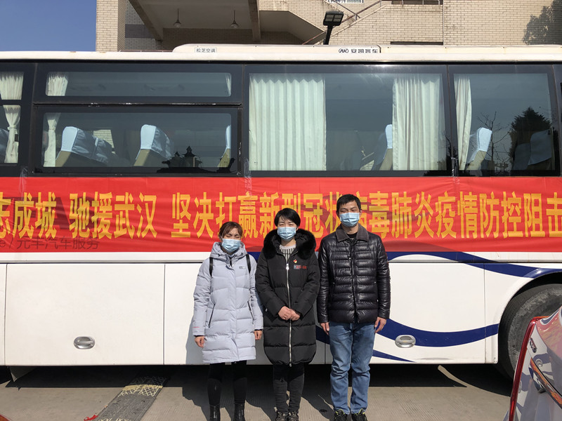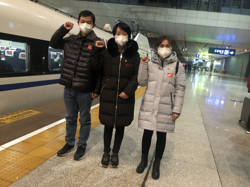 2月9日傍晚,我院援鄂医疗队陈录坤(左一)、吕绍蕊(中间)、文道琴(右一)到达武汉
