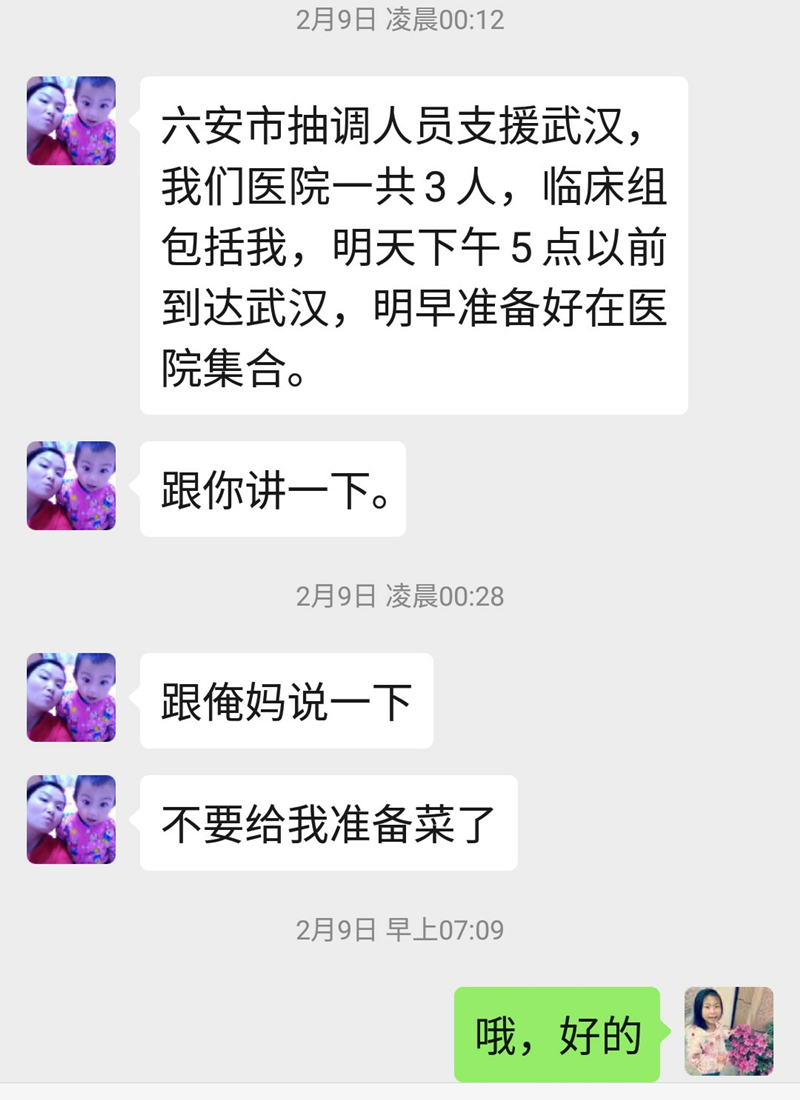 刚哄睡好陈小宝,数一数日子,你已经在武汉十多天了,回想起你刚要走时给我发的信息,心里真不是滋味,因为我知道你将要去面临的工作是有多么危险,小宝才满4个月,陈芳怡还在上幼儿园,我和两个孩子都需要你,你却毅然决然的报名去参加武汉支援。记得你刚走的那天,我们科室主任及科室同事打电话,发微信过来安慰我,我害怕听到她们安慰的话而难过哭泣,所以关掉了手机。立即联系我在武汉的同学,看看可能帮上忙,并跟在麻城的妹妹打电话,说到你去武汉支援疫情了,没成想妹妹和妹夫说的第一句话就是:湖北人民感谢你!顿时觉得你的形象高大起来了,是啊,湖北人民感谢你,说起来你也算是湖北的女婿,去湖北支援疫情也是义不容辞,理所当然。但是,理智告诉我,前方是肆意的新型冠状病毒,具有很强的传染性,人人都避恐不及,谈之色变。但是你说作为医务人员,你必须有担当,你必须迎难而上,你没有退路。好吧,我能理解,但我希望你在救治病人的同时,也能好好吃饭,好好休息,好好保护好自己,早日打赢这场没有硝烟的战争,我和两个小宝期盼着你早日回来。