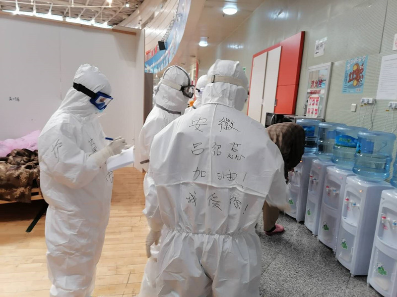 上午10:00,我邀上武汉这边院感的高老师,我们相互检查好各自的装备,高老师给我防护服上写上了“安徽吕绍蕊加油!—我爱你!”的文字,一是识别,二是鼓励。一切穿戴整齐后进舱,我们要把每一个环节都看好,从缓冲间一间间查找问题,总共梳理了十二条问题,有的就现场解决,有的就拍下来待商讨一一解决。“纸上得来终觉浅,绝知此事要躬行”要想科学高效地发现问题、解决问题,只有实地查看,才知道到底是什么情况。实事求是,因地制宜,才可以针对性解决问题。