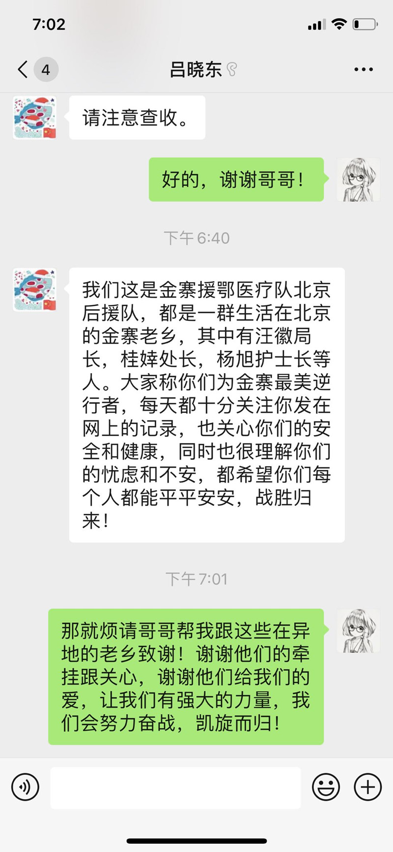 下午又接到医院黄书记的留言,说我的堂哥要给我寄防护物资。原来是我远在北京的东哥,他们是金寨援鄂医疗队北京后援队,都是一群生活在北京的金寨老乡,其中有汪徽局长、桂婞处长、杨旭护士长等人。知道我们去武汉支援了,十分关注我们,也很关心我们的安全和健康!所以给我们又寄来了一些隔离衣。下午下班回来,收到家乡寄来的物资,又收到了新手机和卡,迫不及待的装上,我终于可以通信了!
