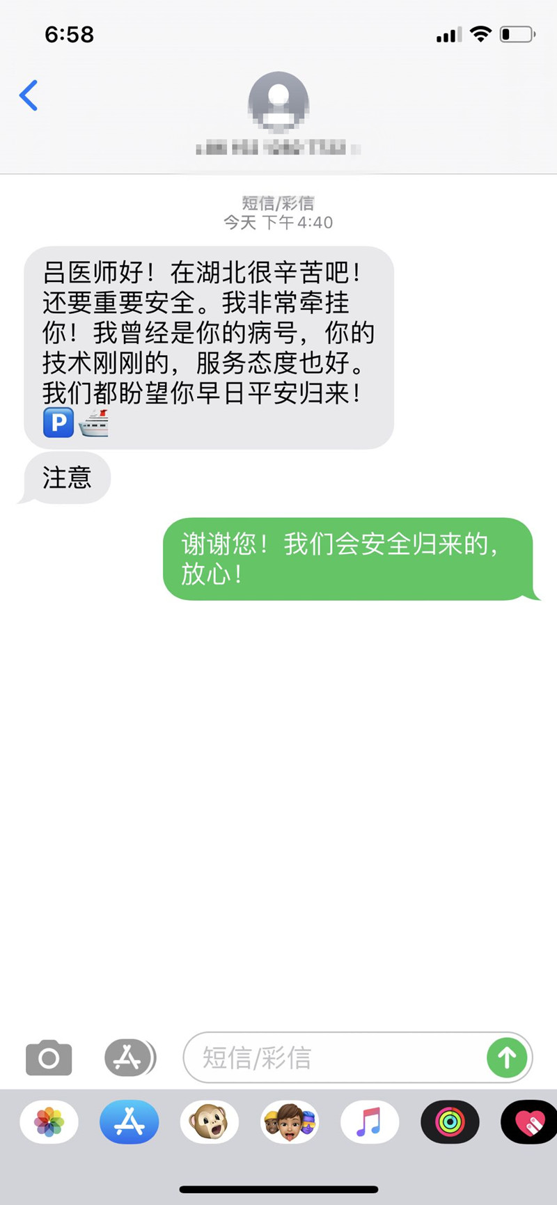 家乡曾经的病号发给我的问候信息,让我深受感动,我们一定不辱使命,圆满出色完成援鄂任务,平安归来!