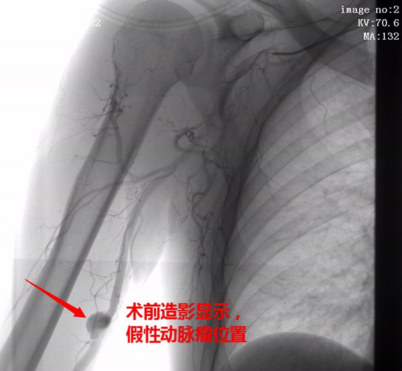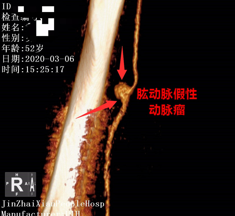 2020年3月5日来我院超声检查示:右侧肱动脉假性动脉瘤。次日,CT血管成像示:右侧肱动脉中段见一直径约13mm结节状高密度影,呈明显强化影,广基底。诊断结果: 右侧肱动脉假性动脉瘤。查体:右侧肱骨中段触及一搏动性包块,活动度差。