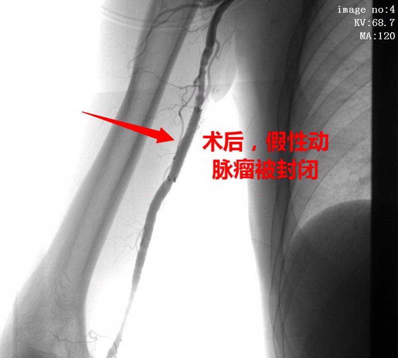 经我院外周介入科积极完善术前准备,于3月12日在DSA下为该患者行“右侧颈内动脉造影、右上肢动脉造影+右肱动脉假性动脉瘤覆膜支架腔内隔绝术”。术后查体:右侧肱骨中段触及包块,搏动性消失,听诊无杂音,包块缩小。