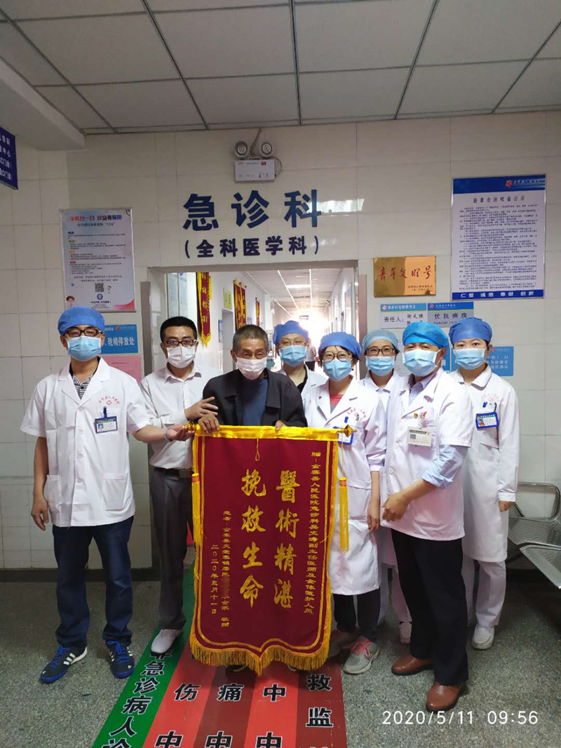 5月11日上午,金寨县人民医院急诊科走廊里,一位头发花白的老人在家人陪同下,紧紧握住六安市人民医院驻我院急诊科帮扶专家吴文涛副主任医师的手,热泪盈眶,激动地说“谢谢好医生,是您救了我的命......”!并将一面写着“医术精湛,挽救生命”的锦旗送到他面前,感谢他及县人民医院急诊科全体医护人员的及时救治,帮助他战胜病魔,转危为安,今日痊愈出院。
