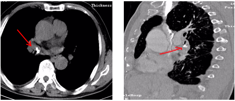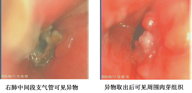 70多岁的殷大爷近二个月来反复出现咳嗽、咳痰伴呼吸困难,服用很多药物后病情仍未见好转,严重影响了他的生活,深受病痛折磨的他于近日来到县人民医院呼吸与危重症医学科检查。入院后接诊的温大夫立即给他完善了胸部CT检查,检查提示双肺炎性病变;右肺门增大,建议治疗后复查及增强扫描。入院诊断考虑肺炎、肺部占位待排,拟进一步行支气管镜检查。在进行支气管镜常规术前讨论时,在万钧博士带领下,科室全体医护人员对殷大爷的病史进行了仔细认真的讨论,考虑为气管异物的可能性大。在反复追问殷大爷,他对自己是否有进食呛咳的情况完全没有印象。我们又进行了进一步检查,胸部增强CT显示右肺中间段支气管腔内高密度影,异物可能。