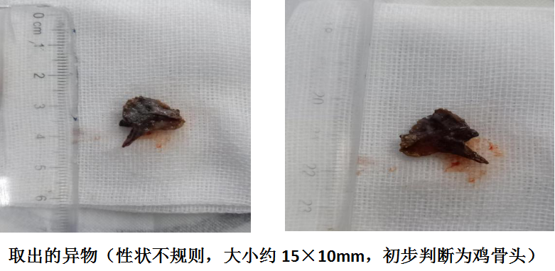因异物对气管的损伤,患者反复出现肺部感染,且出血的风险较大,但这种情况需尽早将其取出,否则患者的感染得不到有效的控制,且异物的长期存在将产生更严重的后果。在与家属沟通后,该科做了充分的术前准备,于2020年6月17日下午为殷大爷进行了支气管镜检查。不出所料,镜子下可以清晰的看到右肺中间段支气管处有一异物阻塞管腔,周围已经有肉芽组织生成。万钧博士用他精湛的气管镜技术,终于将“罪魁祸首”取出,这是一块不规则的骨性异物(如下图),如果不及时取出,很有可能因为尖锐外形穿破气管、血管等可导致致命性大出血、或感染迁延不愈。