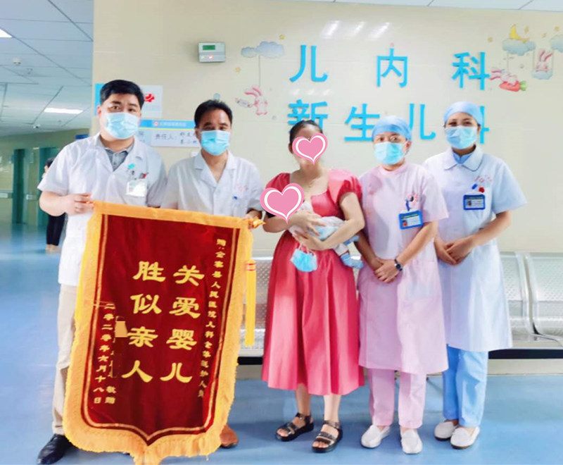 6月3日晚上20:30,一阵急促的电话铃声打破了县人民医院新生儿科危重症病房的宁静,被告知有一名孕33+6周,胎盘早剥,臀位,剖宫产的患儿将入住新生儿科。值班护士立即通知科室主任副主任医师王浩和护士长黄凤玲,组织人员处于应急急救接诊状态。经新生儿疾病早期识别,患儿面色青紫,呼吸急促,医护人员立即将患儿置于抢救单元,予保暖、平卧、头偏一侧,低压吸引、中心吸氧、清理呼吸道......,经过一系列急救措施后,患儿面色红润、呼吸平稳、哭声响亮。经综合考虑,此时为患儿选择转院的最佳时机,随即医生与家属沟通,护士立即联系了120急救中心,将患儿护送到救护车上,并为患儿配备了吸痰管、吸氧头罩等急救用物,以保证患儿转运途中安全。目前该患儿已从上级医院治愈出院,今天上午,患儿母亲带着两面锦旗来到县人民医院新生儿科及120急救中心,亲自感谢医护人员及时的抢救及护送,为宝宝康复赢得了时机。