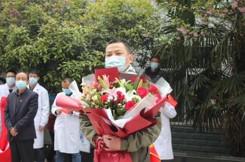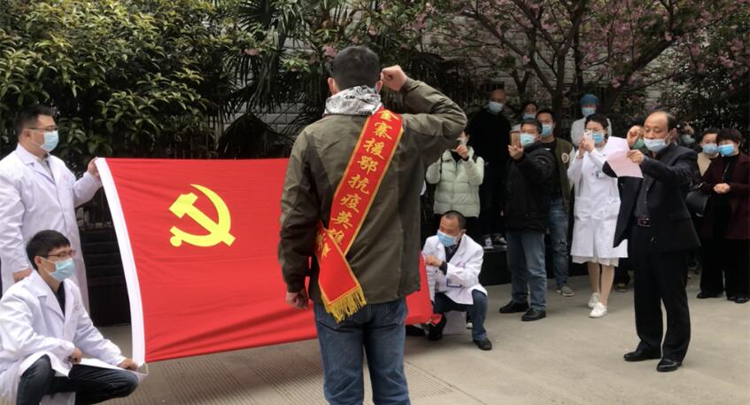 座谈会结束后,上午11时左右,载着我院3位援鄂医疗队员的车辆到达医院大门,医院医护人员手捧写有“悬壶入荆楚 凯旋归家乡”、“欢迎英雄回家”、“致敬最美逆行者鲜花献给最美丽的你”、“春暖花开 英雄归来”等标语的条幅、标牌夹道欢迎,并敬献鲜花。在热烈感人的氛围中队员陈录坤同志火线入党的宣誓环节成为欢迎仪式上最美的风景。