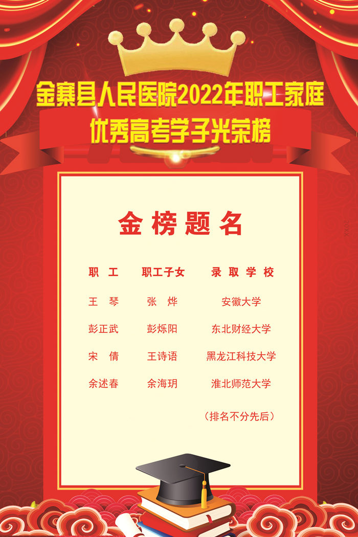 “满池荷花送清香,喜讯传来心荡漾。”在这个惠风和畅、放飞理想、收获希望和欢乐的美好时节,金寨县人民医院参加2022年高考的职工子女捷报频传,一份份沉甸甸、红彤彤的录取通知书陆续送达莘莘学子手中,它承载的是希望,放飞的是梦想,是院职工家庭的喜悦,更是医院大家庭的自豪。