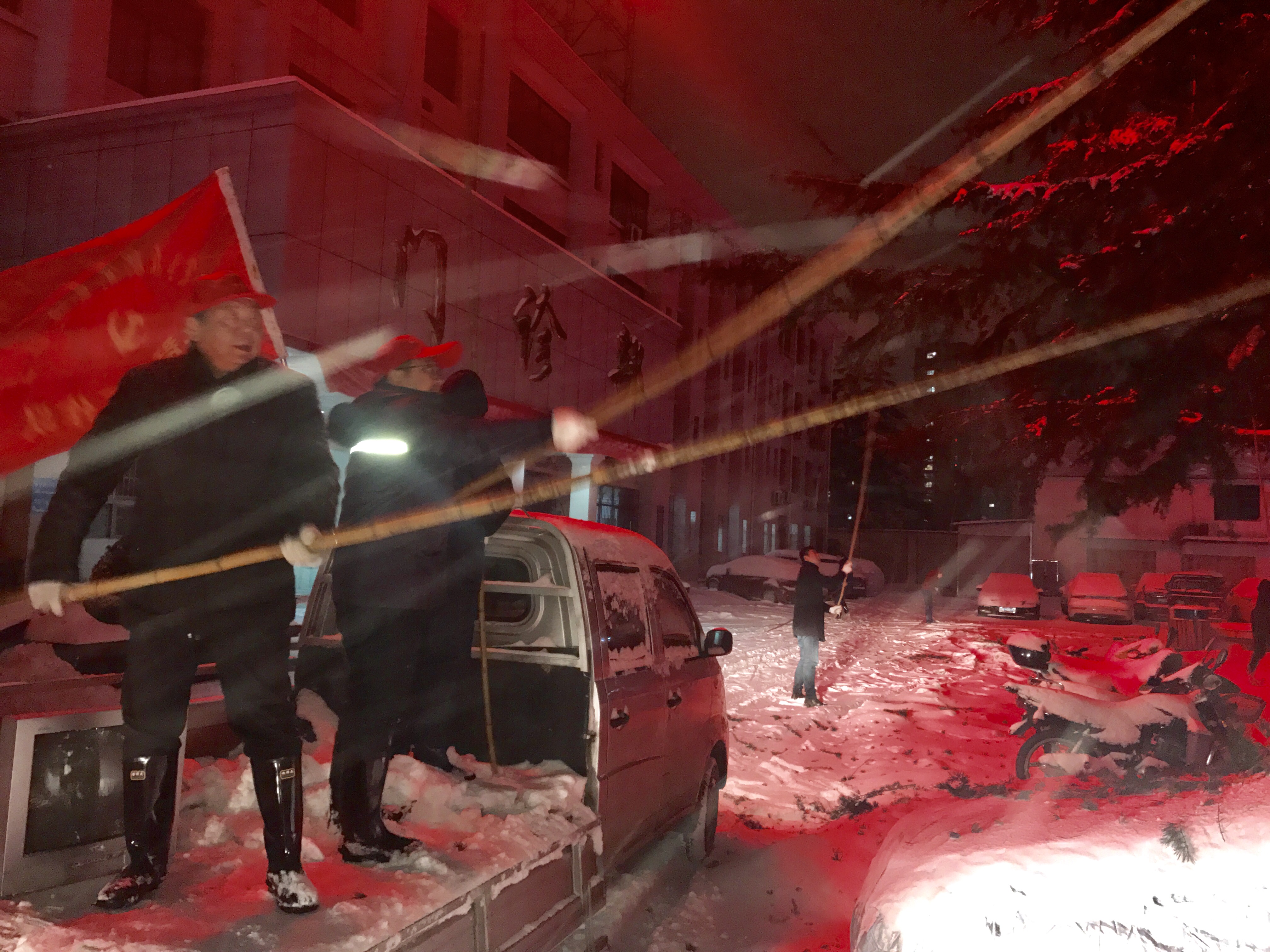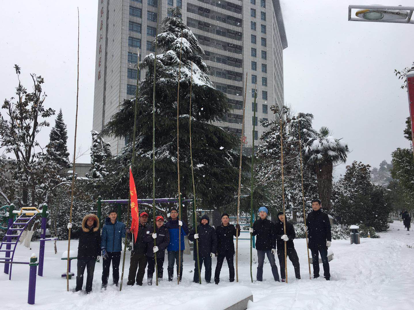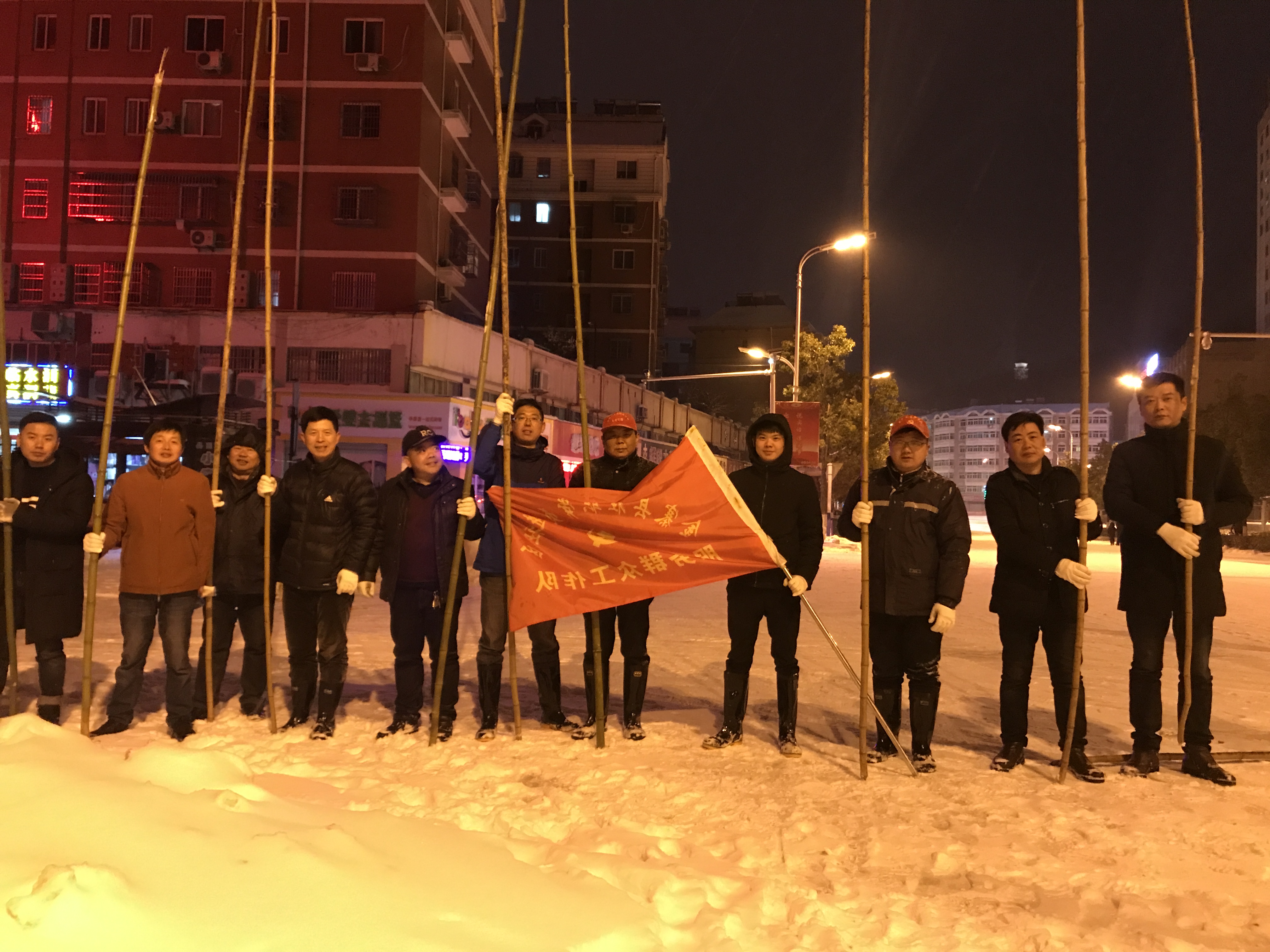 无论是大雪纷飞的白天,还是寒冷零下摄氏度的夜晚。在党委书记吴杰的号召下,全体行政科室党员、干部、预备党员、入党积极分子积极响应,扛着沉重的竹竿,踏进冰冷的雪堆,你一竹竿,我一竹竿,他一竹竿的在包保责任路段,维护着珍贵的园林绿化树木。他们就像这座魅力城市的绘画家,一人一根竹竿,让醒目的绿更加鲜艳!