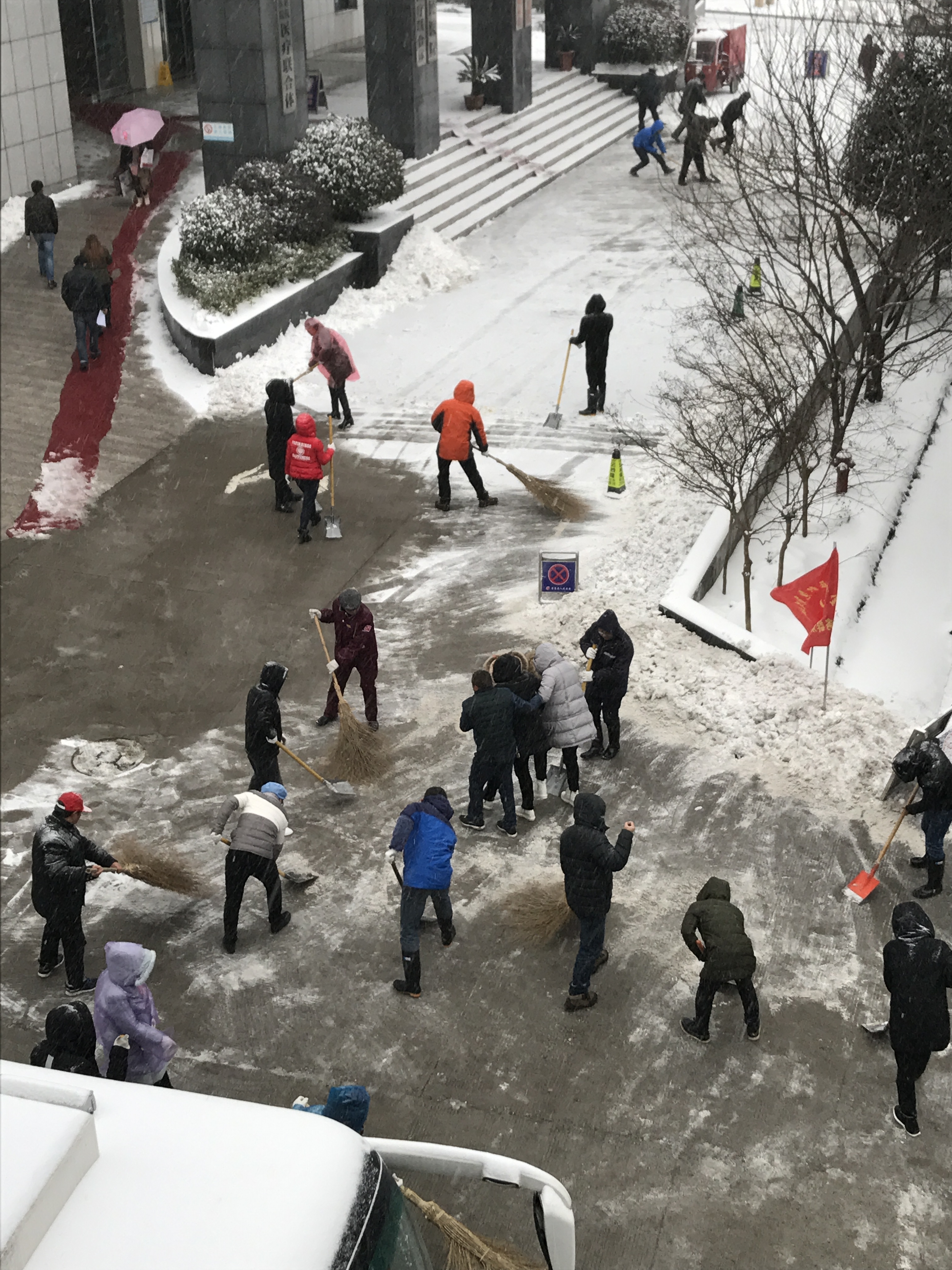 1月24日始,院行政科室全体人员开展除雪活动。有的拿雪橇,有的拿扫把,你一橇,我一铲,他一扫,就像在聚精会神创作中的书法大师,在被大雪覆盖得雪白的路面及公交站台勾勒出一条一条绿色通道。