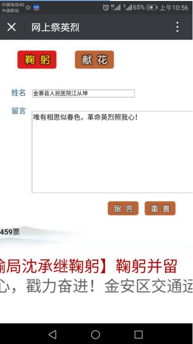 在医院工作群号召全院广大干部职工在烈士褒扬网站参加留言、献花等祭奠活动,形成倡导崇尚英雄烈士、保护英雄烈士的良好风尚。
