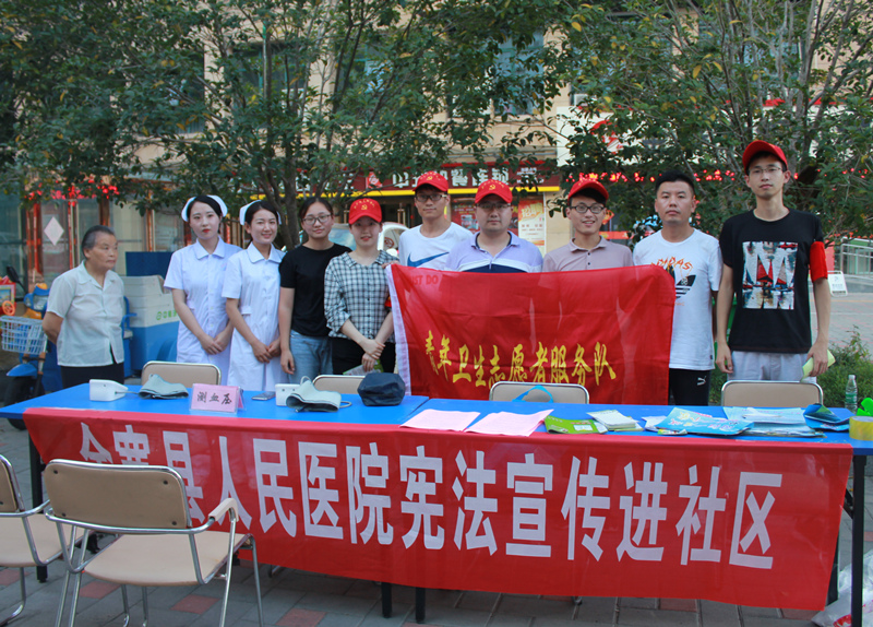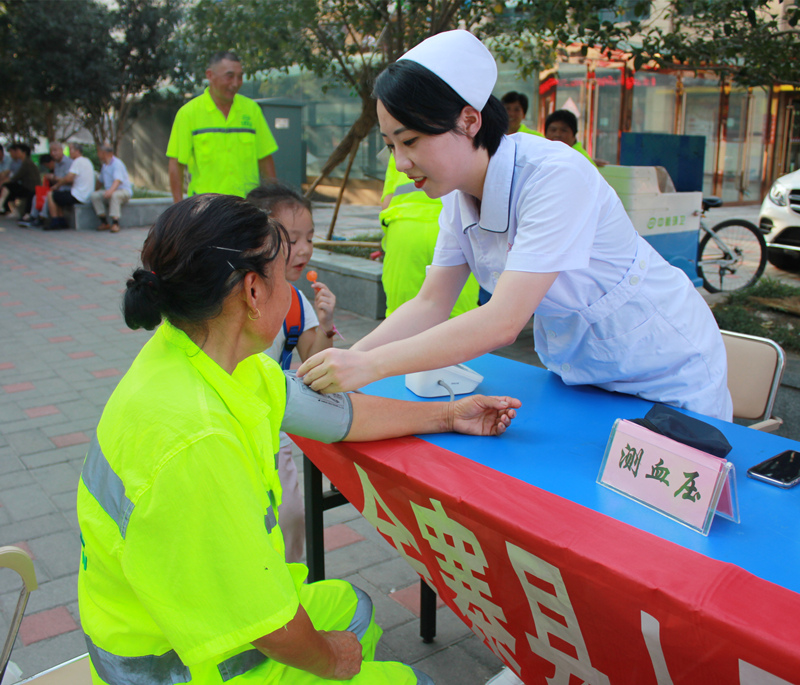 活动中,大家为社区居民提供测血压、健康咨询、发放健康宣教手册、宣传宪法、捡拾垃圾等志愿活动。