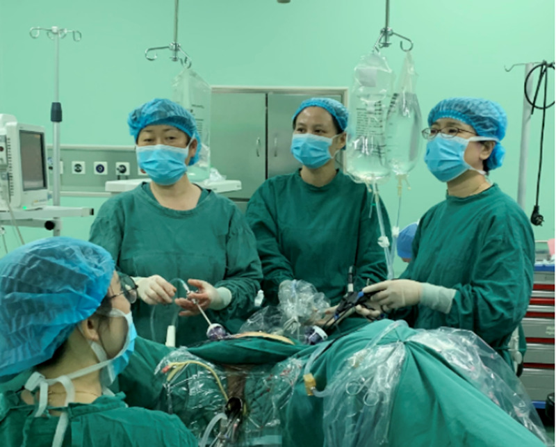 中日友好医院梁静主任和县人民医院陈梓芹主任正在为患者行腹腔镜手术